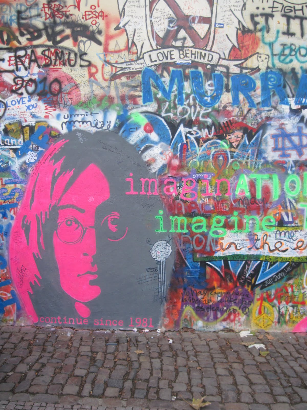 The Lennon Wall is coated with graffiti art that stretches back to the times when Communism had its hold over the Czech Republic, then part of the larger Czechoslovakia. Lyrics of Beatles songs trail off into inspirational quotes, meshing with peace signs and portraits of Lennon himself. The highest parts of the wall contain scattered tags, including the word "láska," Czech for love. These bits and pieces are the signatures of those committed enough to reach higher to the empty spaces that remain as unused canvas, begging onlookers to help them take their rightful places as bearers of love, peace and hope. The rest of the wall is art blended into art, and times blended into times, creating a lasting and living tribute to not just John Lennon, but the ideals of love and empathy that he lived for, and plead for with his music, which today remains every bit as permanent as the very wall I now stand in front of.